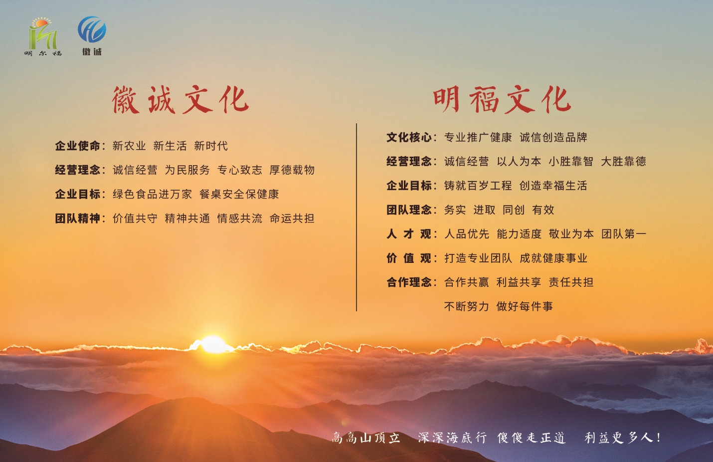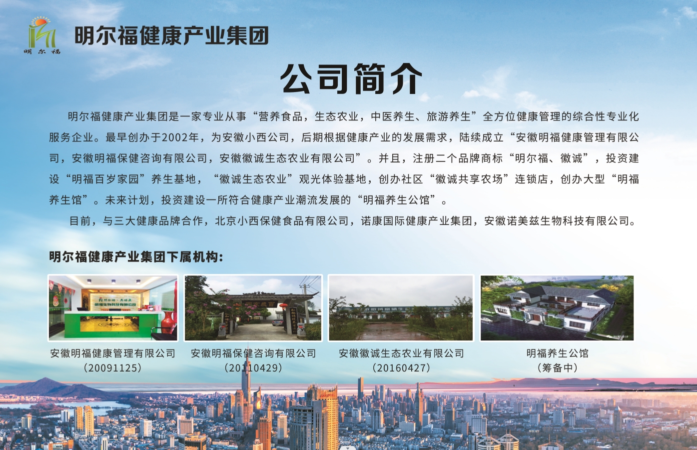 安徽明福健康管理有限公司隶属于明尔福健康产业集团,是一家专业从事旅游养生,生态农业,营养食品全方位健康管理服务为一体的综合性企业。创办于2002年,为安徽小西公司。后期根据健康产业的发展,陆续成立了安徽明福健康管理有限公司、安徽明福保健咨询有限公司和安徽徽诚生态农业有限公司。先后注册了两个品牌商标“明尔福”和“徽诚”。2006年开始,陆续投资建设了“明福百岁家园”养生基地、“徽诚生态农业”观光体验基地。于2020年创办了“徽诚共享农场”连锁店。2024年3月,投资了一所符合健康产业发展潮流的“明福养生公馆”。
